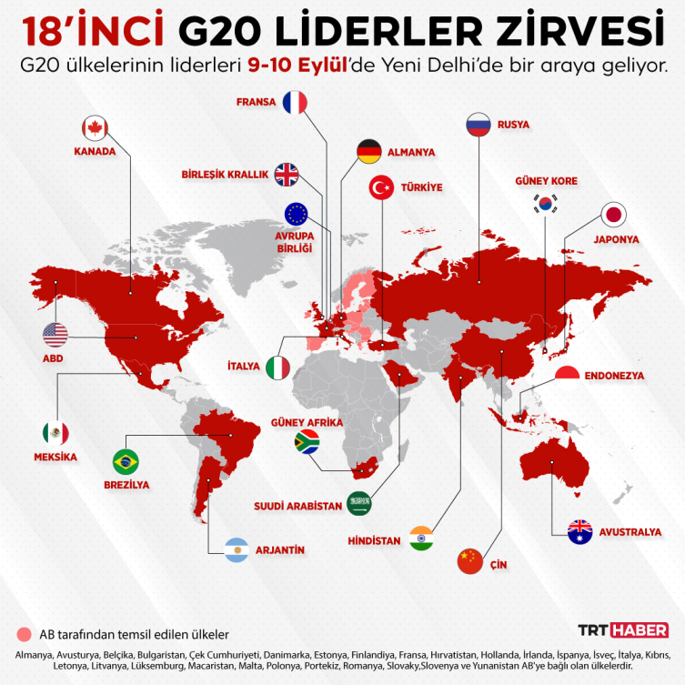 ABD, Almanya, Arjantin, Avustralya, Brezilya, Çin, Endonezya, Fransa, Güney Afrika, Kore, Hindistan, İngiltere, Japonya, Kanada, Meksika, Rusya, Suudi Arabistan, Türkiye ve grubun 20’nci üyesi Avrupa Birliği.