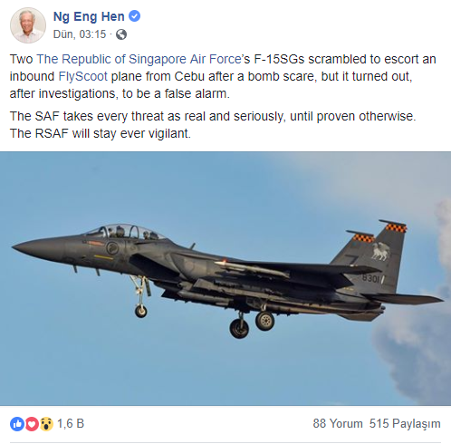 Sosyal medya sitesi Facebook’ta yaptığı paylaşımla olayı kamuya duyuran Singapur Savunma Bakanı Ng Eng Hen, F-15 tipi 2 savaş uçağının Scoot Havayollarına ait bir yolcu uçağından yapılan bomba ihbarı üzerine havalandığını ancak bunun yanlış alarm olduğunu söyledi.