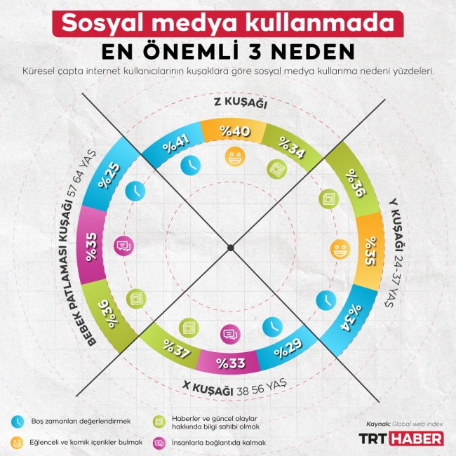 Yüzde 35’i eğlenceli içerikler bulmak, yüzde 34’üyse boş zamanlarını geçirmek için sosyal medya kullandı.