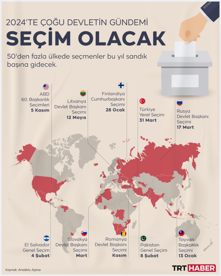 2024 İsrail'in Gazze'ye yönelik saldırıları ve neredeyse iki yıldır süren Rusya-Ukrayna savaşı gibi önemli olayların gölgesinde başladı. Yeni yılda yapılacak seçimlerle birlikte, dünya genelindeki olaylar ve değişiklikler büyük bir öneme de sahip olacak. ABD ve Rusya gibi iki büyük güç, yeni liderlerini belirleyerek küresel dinamiklere etki edecek.