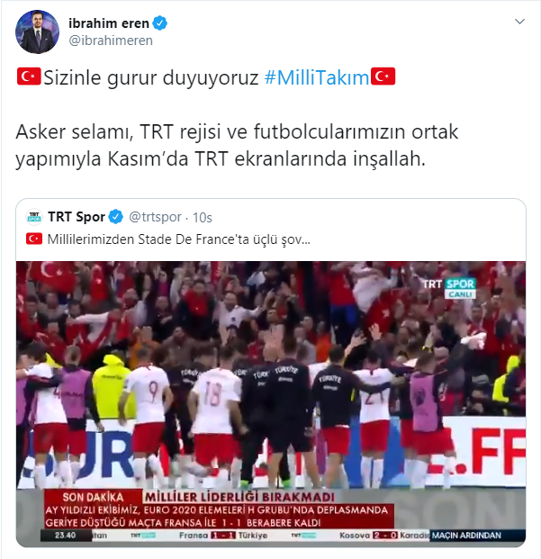 Eren açıklamasında "Sizinle gurur duyuyoruz. Asker selamı, TRT rejisi ve futbolcularımızın ortak yapımıyla Kasım’da TRT ekranlarında inşallah." ifadelerini kullandı.