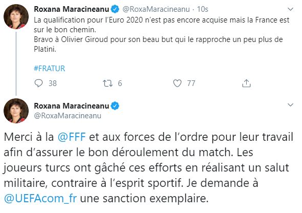 Fransız bakan Maracineanu, "UEFA'dan bu konuda yaptırım uygulanmasını talep ediyorum" dedi.