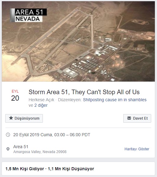 Facebook’tan düzenlenen bir etkinlikle, içerisinde uzay çalışmaları yapıldığı düşünülen ve hatta kimileri tarafından uzaylıların incelendiği iddia edilen 51’nci Bölge’ye baskın yapma çağrısı yapıldı.