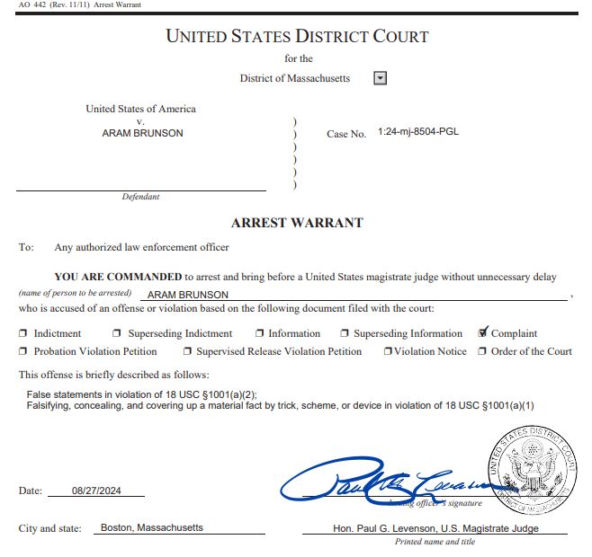Boston'daki sulh hukuk hakimi Payl Levenson, Brunson hakkında tutuklama emri çıkardı.