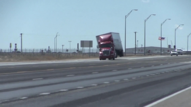Teksas eyaletinde bulunan Potter bölgesindeki Amarillo şehrinde bir tır trafikte ilerlediği sırada şiddetli rüzgar nedeniyle devrildi. Tırın devrilme anını bir amatör kamera kaydetti.