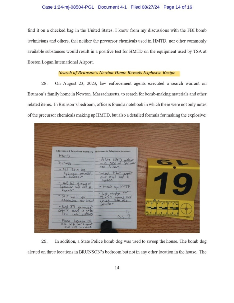 Havaalanı güvenlik birimleri tarafından Brunson'ın çantalarından birinde patlayıcı organik bileşik olan hekzametilen triperoksit diamin tespit edildi.