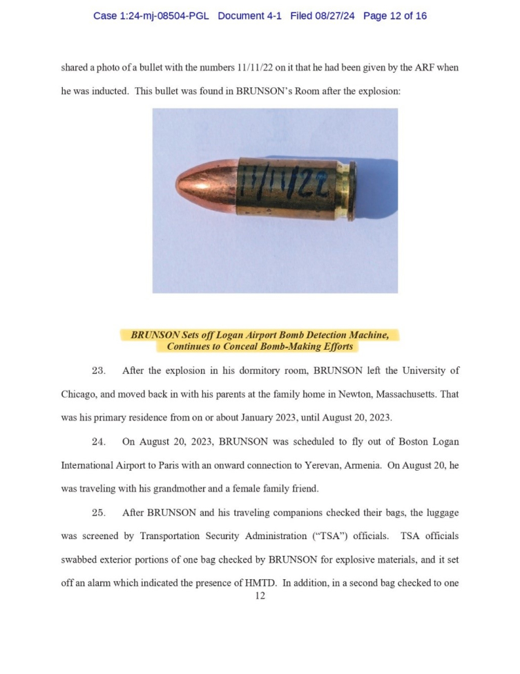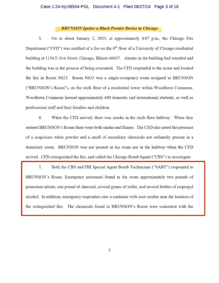 FBI'ın 17 sayfalık suç duyurusuna göre Ermeni Brunson 2 Ocak 2023'te Chicago Üniversitesi ikinci sınıf öğrencisiyken kampüs konutlarındaki odasında yangın çıktı ve Brunson'ın barutlu bir aygıtı ateşe verdiği anlaşıldı.