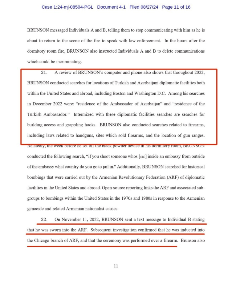 Bomba yapımı ile Türkiye ve Azerbaycan'ın diplomatik misyonları ve büyükelçilerine saldırı hazırlığında olduğu anlaşılan Chicago Üniversitesi eski öğrencisi Brunson’ın şu an Ermenistan’da olduğu da suç duyurusunda belirtildi.