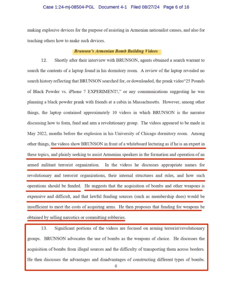 FBI'ın suç duyurusunda, Brunson'ın videolarında bomba üretiminde uzman olduğu ve silahlı terör örgütü kurmak isteyen Ermenilere destek olmayı amaçladığını söylediği belirtiliyor.