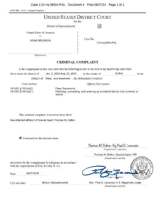 FBI Ermeni Brunson hakkında yanlış beyanda bulunmak ve hile, aldatma ve entrika yoluyla somut unsurları tahrif etmek, gizlemek ve örtbas etmekten hakkında suç duyurusunda bulundu.