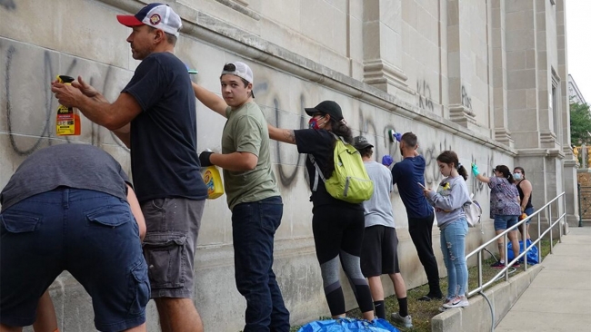 [Fotoğraf: Facebook]Saldırıdan hemen önce çekilen bir fotoğrafta da protestocular tarafından duvara yazılan slogan ve grafitileri silen bir ekibe katıldığı görülüyor.