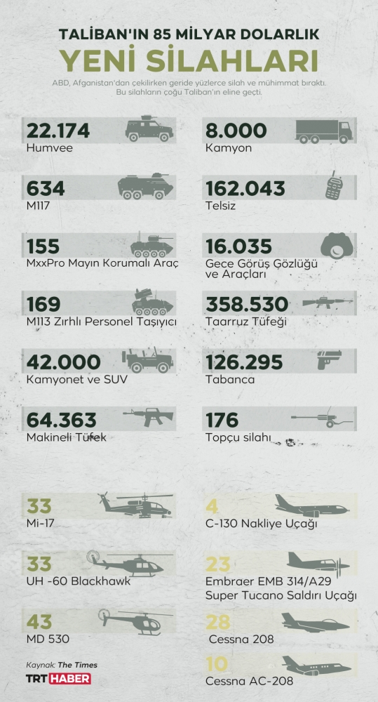 Taliban bu silahlardan bazılarını teslim olan ya da yenilen Afgan güçlerinden aldı. Apar topar askeri üslerden ayrılan Amerikan ordusu da mühimmatın bir kısmını geride bırakmıştı.
