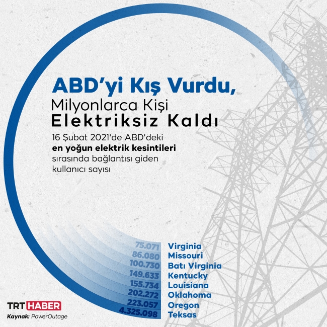 30 milyon civarında insanın yaşadığı Teksas'taki evlerin yüzde 60'ı ısınmak için elektriğe ihtiyaç duyuyor ve aşırı talep kara kışla birleşince milyonlarca kişiyi elektrik kesintisine maruz bıraktı. İnternet bağlantıları çöktü.