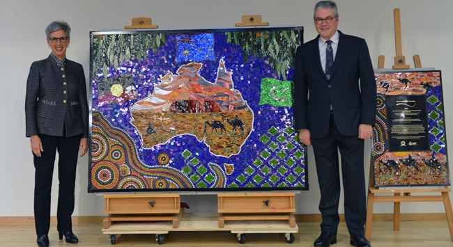 Mozaik tablo, Avustralya'ya 1800'lü yıllarda, demir yollarında, taşımacılık ve maden sektörlerinde çalışmak üzere Afganistan ve Hindistan'dan gelen Müslümanların Aborjinlerle ilişkilerini temsil ediyor.