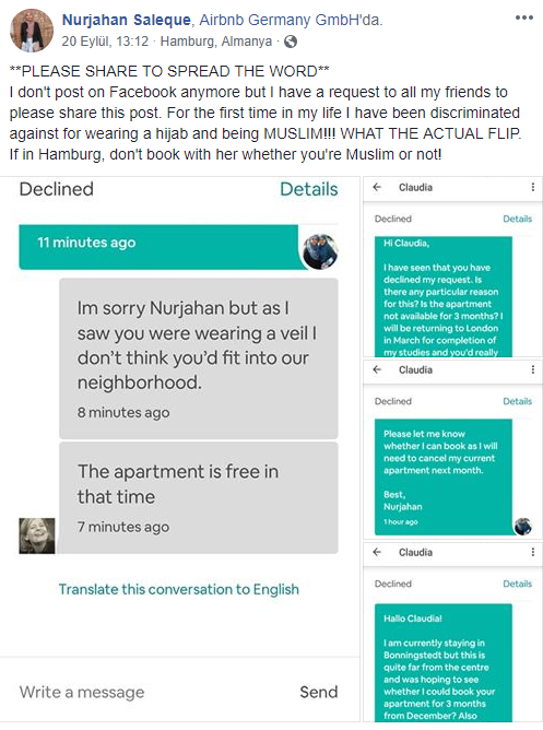 BuzzFeed News'te yer alan habere göre Almanya'nın Hamburg şehrinde nörobilim eğitimi gören İngiliz öğrenci Nurjahan Saleque, evinin merkeze daha yakın olması için uluslararası ev ve oda kiralama sitesi Airbnb'de bir ev sahibi ile iletişime geçti.