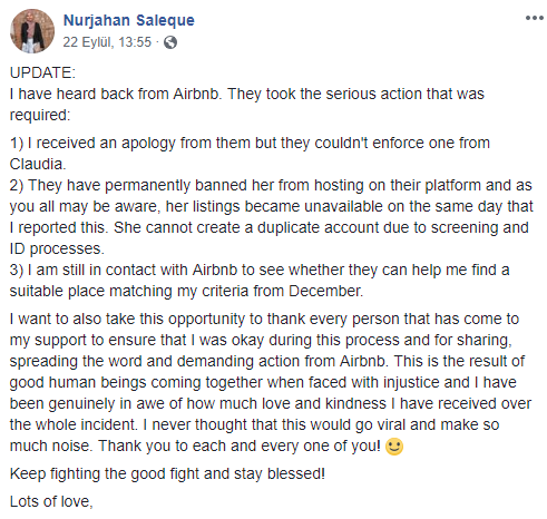 Saleque daha sonra yaptığı açıklamada Airbnb yetkililerinin kendisinden özür dilediğini ve ev sahibinin siteye erişiminin engellendiğini söyledi.