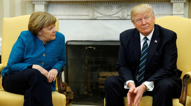 Merkel, ABD Başkanı ile ilk buluşmasını 2017 yılının Mart ayında gerçekleştirdi. Soğuk atmosferde geçen buluşma sırasında Trump, fotoğrafçıların el sıkışmaları için yaptıkları çağrılara kulak asmamış ve Merkel'in elini ortak basın konferansının kapanışında sıkmıştı.