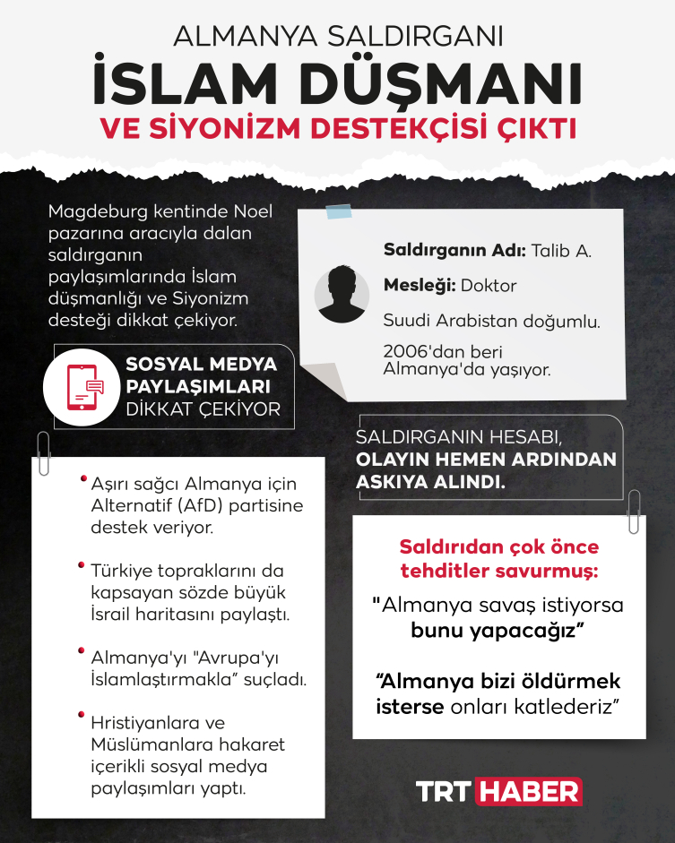 Saldırganın Aralık 2023'te paylaştığı bir X mesajında ise Alman devletini, Suudi Arabistanlı mültecilere zulmetmekle suçladığı ve "Sizi temin ederim ki intikam yüzde 100 gelecektir. Hayatıma mal olsa bile" tehdidinde bulunduğu, devamında "Bunun bedelini Almanya ödemek zorunda kalacak. Çok büyük bir bedel." ifadelerine yer verdiği belirtiliyor.