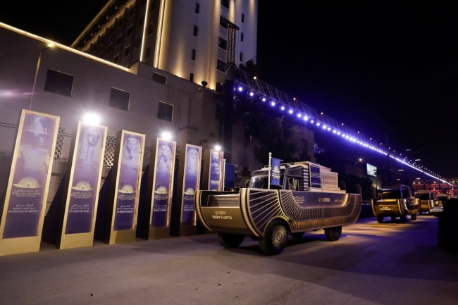 Mumyalar, her kral ve kraliçenin adına özel olarak hazırlanmış antik Mısır tarzında dekore edilmiş altın renkli araçlarla nakledildi.
