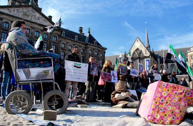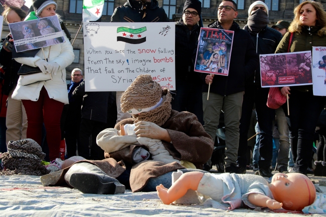 Suriye Komitesi tarafından Dam Meydanı'nda düzenlenen gösteride, Esed rejimi ve Rusya karşıtı pankartlar açılarak, Suriye'de katliamların durdurulması çağrısı yapıldı.