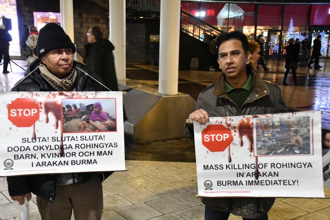 Bangladeşli vatandaşların kurduğu Rohingyalılara Destek Komitesi tarafından Sergels Torg Meydanı'nda düzenlenen gösteriye İsveç Rohingya Derneği de destek verdi.