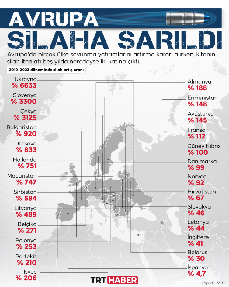 Stockholm Uluslararası Barış Araştırmaları Enstitüsü'nün (SIPRI) küresel silah transferlerine ilişkin raporuna göre, Avrupa'da savaş uçakları, tanklar ve denizaltılar gibi silah ithalatı 2019-2023 döneminde 2014-2018 dönemine kıyasla yaklaşık yüzde 94 arttı.