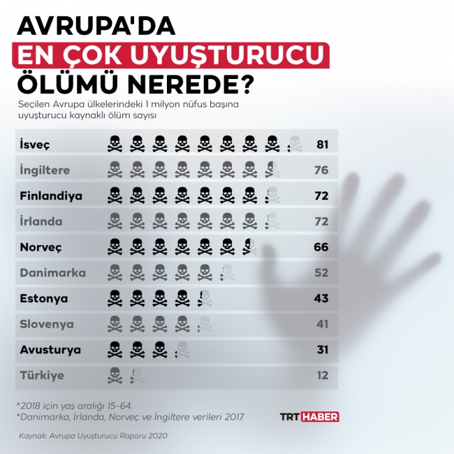 Dünyanın mücadele ettiği bir başlık da uyuşturucu. Son Avrupa Uyuşturucu Raporu’na göre, İsveç milyon nüfus başına en çok uyuşturucu kaynaklı ölümü gören ülke. 2018'de 1 milyon kişi başına 81 kişi öldü. İngiltere için bu sayı 76.