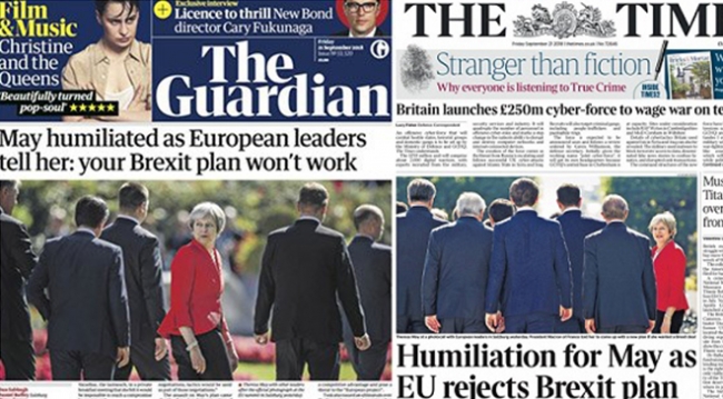 Avrupa Birliği'ne sunduğu ayrılık planı kabul edilmeyen Başbakan, İngiliz medyasının eleştiri oklarının da hedefi oldu. İngilizlerin önemli gazetelerinden The Guardian manşetinde, "May, Avrupalı liderler tarafından rezil edildi: Brexit planın işe yaramayacak" ifadesini kullandı.