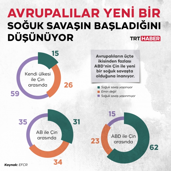 ECFR’nin yayınladığı son rapora göre Avrupalıların çoğu, ABD ile Çin ve Rusya arasında yeni bir soğuk savaşın başladığına ancak kendi ülkelerinin bunun parçası olmadığına inanıyor.