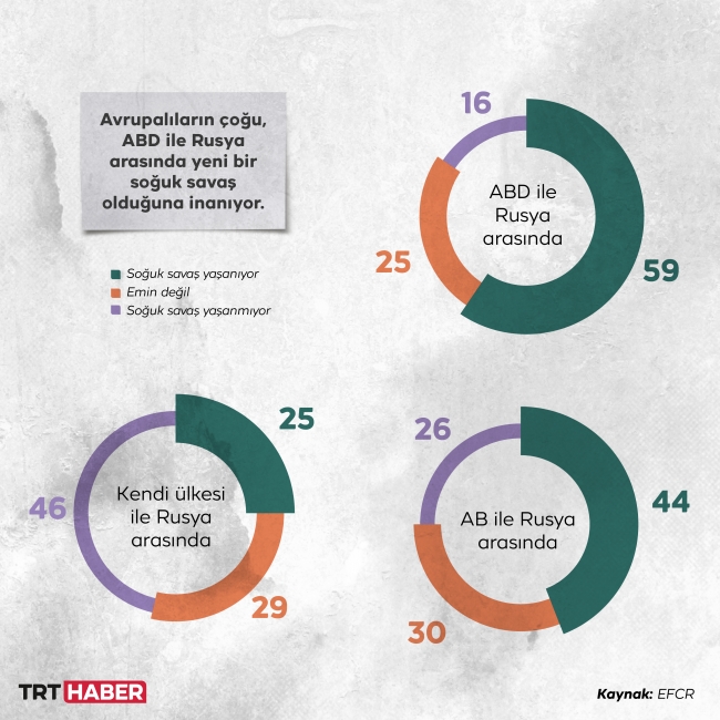 Fransa, Almanya, İtalya, Polonya, Avusturya ve İspanya da dahil olmak üzere 12 ülkeden ankete katılanların yaklaşık yüzde 59'u ABD ve Rusya arasında yeni bir Soğuk Savaş'ın başladığını söyledi.