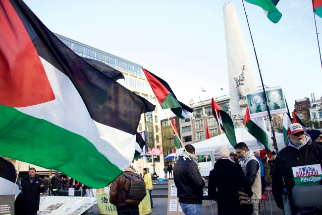 Hollanda Filistin Topluluğu Vakfınca (PGNL) yapılan gösteride, aralarında Hollandalıların da bulunduğu göstericiler, İsrail'in katliamlarına dikkat çekmek için Dam Meydanı'nda toplandı.