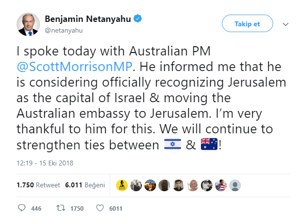 Sosyal medya sitesi Twitter'daki hesabından Başbakan Morrison’a teşekkür eden İsrail Başbakanı Binyamin Netanyahu, ‘‘Avustralya Başbakanı Scott Morrison ile bugün konuştum. Bana Kudüs'ü resmen İsrail'in başkenti olarak kabul etmeyi ve Avustralya Büyükelçiliğini Kudüs'e taşımayı düşündüğünü söyledi. Bunun için ona çok minnettarım’’ ifadelerini kullandı.