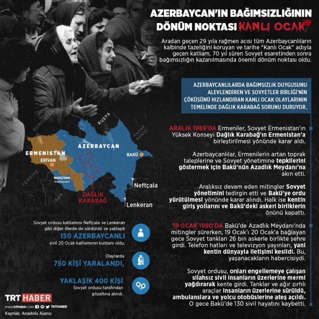 Bugün Azerbaycan'ın yas günü. 29 yıl önce 20 Ocak 1990'da, Ermenilerin artan toprak taleplerine ve Moskova'nın taraflı tutumuna tepkilerini göstermek isteyen Azerbaycanlılar, meydanlarda toplanmaya başladı. Sovyetler Birliği yönetimi protestoları kanla bastırmayı tercih etti.
