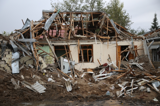 [Fotoğraf: AA]Beylegan kent merkezinde yaşayan Mais Memmedov'un evi de saldırıda tamamen yıkıldı, eşi, kızı ve evlerinde misafir bulunan ikisi çocuk toplam 5 kişi enkaz altında kaldı.