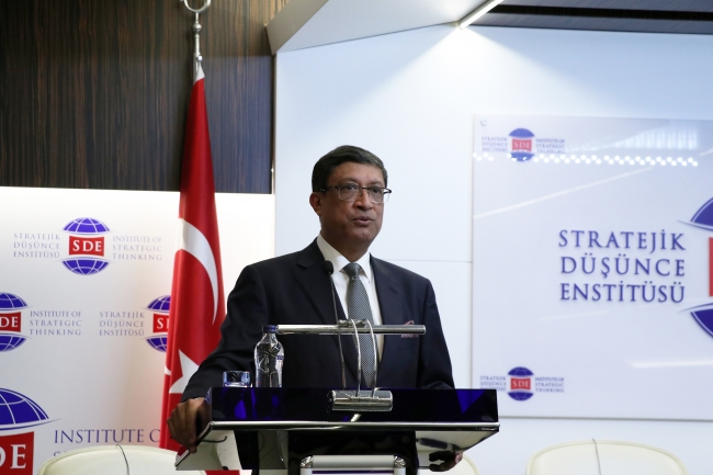 Hindistan’ın uluslararası politikalarını değerlendirmek üzere, Stratejik Düşünce Enstitüsü’nde (SDE) düzenlenen “Uluslararası Sistemin Değişim Sürecinde Hindistan” konulu panele katılan Hindistan’ın Ankara Büyükelçisi Sanjay Bhattacharyya, ülkesinin ekonomik ve stratejik davranış modeline dair birtakım bilgiler verdi.
