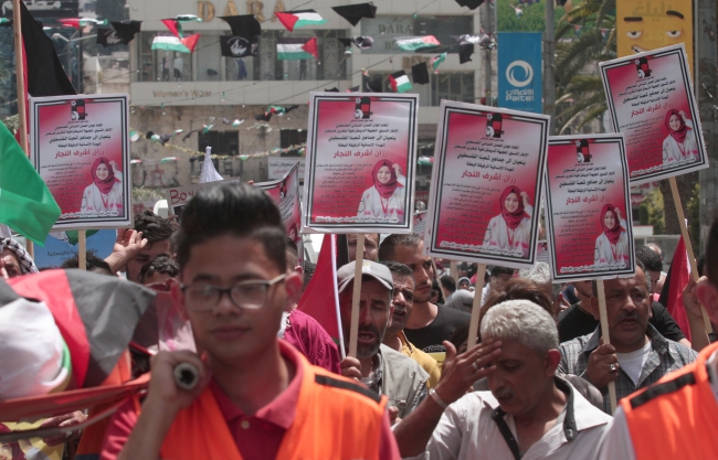 Batı Şeria Nablus'ta onlarca Filistinli, İsrail askerlerinin 21 yaşındaki gönüllü hemşire Rezzan en-Neccar'ı şehit etmesini protesto etti.