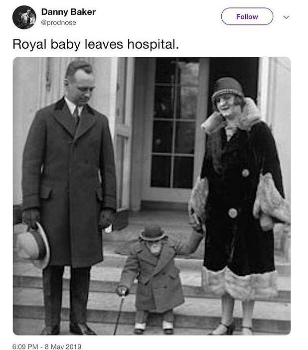 Baker, sosyal medya sitesi Twitter'daki hesabında, bir çifti takım elbise, palto ve şapka giydirilmiş bir şempanzeyle bir binayı terk ederken gösteren siyah beyaz bir fotoğrafı "Kraliyet ailesinin bebeği hastaneden çıkıyor" mesajıyla paylaşmıştı.