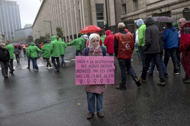 Belçika'nın çeşitli kentlerinden gidip Merkez Tren Garı yakınında toplanan ve hükümet karşıtı sloganlar atan protestocular, emeklilik reformunu eleştiren pankart ve dövizler taşıdı.