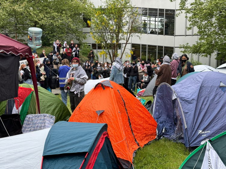 Öğrenciler, üniversitenin iç bahçesi "Theaterhof"ta çadırlar kurarak dayanışma kampı oluşturdu.