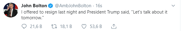John Bolton da Twitter hesabından, "Başkan Trump'a dün gece istifa etmeyi önerdim ve bana 'Bunu yarın konuşalım' dedi" mesajını paylaştı.