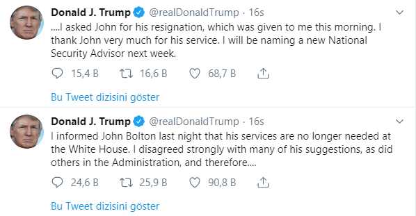 Bolton'ın birçok önerisine şiddetle karşı çıktığını ve yönetimdeki birçok kişinin de kendisiyle hemfikir olduğunu vurgulayan Trump, "Bu nedenle de John'dan istifasını istedim ve bu sabah bana verdi. John'a hizmeti için teşekkür ediyorum" ifadesini kullandı.
