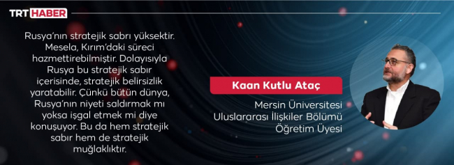 "Rusya’nın stratejik sabrı yüksektir. Bozkır insanı oldukları için dayanıklı yapıya sahiplerdir. Mesela, Kırım’daki süreci hazmettirebilmiştir. Dolayısıyla Rusya bu stratejik sabır içerisinde, stratejik belirsizlik yaratabilir. Çünkü dünya, Rusya’nın niyeti saldırmak mı yoksa işgal etmek mi diye konuşuyor. Örneğin Sullivan dahi 'Rusya’nın niyetini bilemiyoruz' diyor. Bu da hem stratejik sabır hem de stratejik muğlaklıktır. Bu yüzden de Rusya’nın eli güçlü diyebiliriz. Rusya’nın niyetinin ne olduğunu anlayabilmek adına ABD istihbaratının Rusya’nın niyeti, askeri yığınakları gibi konularda değerlendirmelerinin basın yoluyla dünya kamuoyuyla paylaşmasını bir ölçüde de, Rusya’nın niyetinin ortaya çıkarılması anlamında değerlendirmek gerekir. Fakat, Rusya’dan bu konu hakkında “saldırı olmayacak” yönündeki açıklamalar dışında bir cevap da gelmiyor."