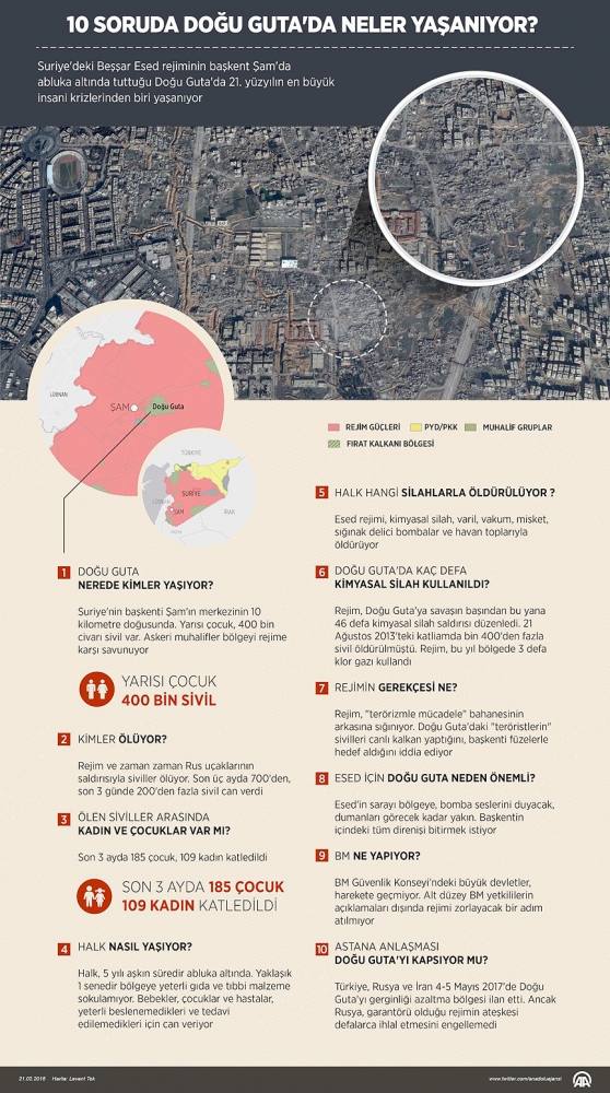 Doğu Guta, Astana anlaşmalarında gerginliği azaltma bölgesi ilan edilmişti ancak Rusya'nın garantörlüğünü üstlendiği Esed rejimi, geçen yıl nisan ayından itibaren bölgeye yönelik ablukasını yoğunlaştırdı ve son aylarda saldırılarını şiddetlendirdi.