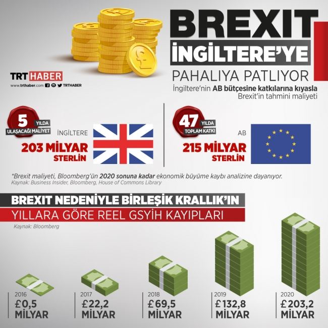 Business Insider internet sitesinin, ekonomi kanalı Bloomberg’ün analizine dayandırarak hazırladığı habere göre, İngiltere'nin AB'den ayrılma kararı nedeniyle ortaya çıkan ekonomik kayıp, 130 milyar sterline ulaştı ve bu yılın sonuna kadar 203 milyar sterline çıkması bekleniyor.