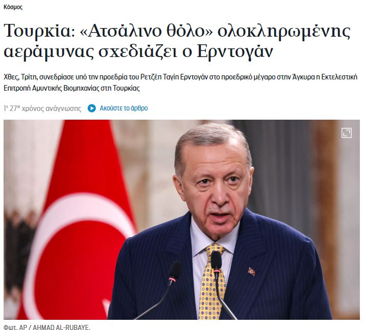 Yunanistan’ın önde gelen gazetelerinden Kathimerini Cumhurbaşkanı Recep Tayyip Erdoğan başkanlığında yapılan Savunma Sanayii İcra Komitesi’nde alınan kararları haberleştirdi.