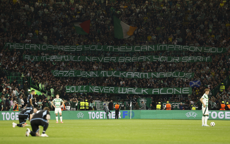 İç sahada oynanan birçok karşılaşmada İsrail işgali altındaki Filistin'e destek veren yeşil-beyazlı takımın taraftarları, Celtic Park ev sahipliğindeki Slovan Bratislava mücadelesinde de açtıkları pankart ve bayraklarla desteğini sürdürdü.