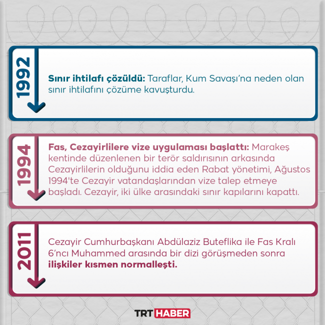 Cezayir'in bağımsızlığını kazanmasından sadece bir yıl sonra Fas'ın kendi toprakları olduğunu iddia ettiğini sınırdaki bazı bölgeleri silah gücüyle ele geçirme girişimi iki komşu ülkenin ilişkilerini erken bir safhada zehirledi.