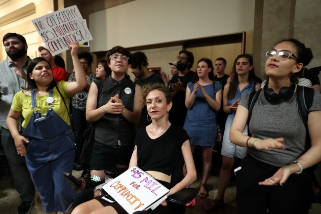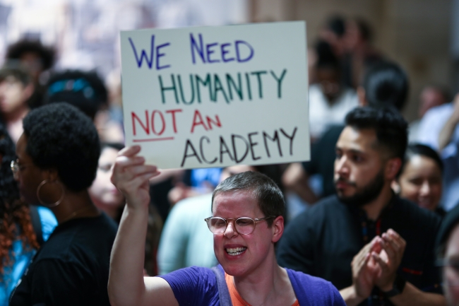 Chicago Belediye Başkanı Rahm Emanuel'in günlerdir kent gündemini meşgul eden ve şehre yaklaşık 95 milyon dolar maliyetle "polis akademisi" yapılmasını öngören tasarısı Belediye Meclisinde oylandı. Bu sırada Chicago Belediyesi içindeki salonun lobisinde toplanan yüzlerce kişi Belediye Başkanı Emanuel ve politikalarını protesto etti.