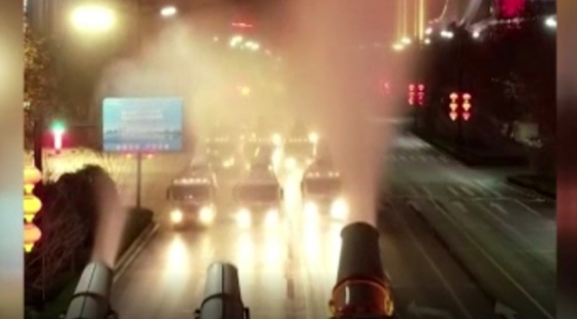 Luoyang şehrinde yüzlerce kamyon bir araya gelerek, korona virüsüne karşı gece boyunca sokaklara dezenfektan sprey sıktı.
