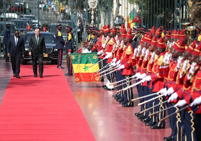 Cumhurbaşkanlığı Sarayı'na gelişinde makam aracından inerken Cumhurbaşkanı Sall tarafından karşılanan Erdoğan, iki ülkenin milli marşlarının çalınmasının ardından tören kıtasını selamladı.